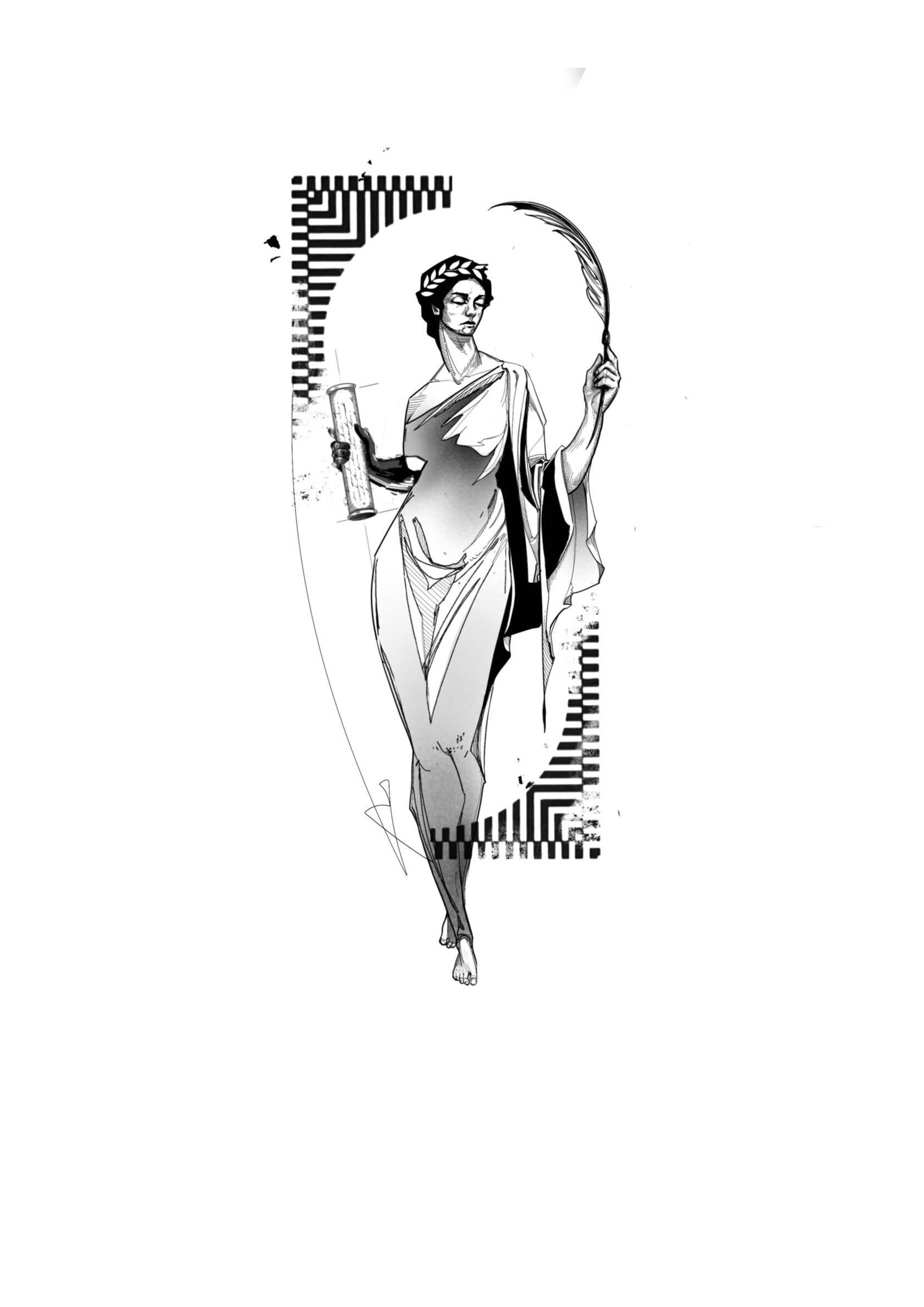 Calliope is the boldest of the nine muses - the one who carries a spine of fire behind her composed gaze. Known as the Muse of epic poetry and eloquence, she was said to inspire heroes and kings, guiding their destinies with the sharp tip of her quill. The myths call her the "chief" of the Muses, the one who speaks with the voice of authority. She holds both the scroll and the feather — symbol of memory and movement — and walks not just through stories, but through time. Where she goes, legacy follows. She's not about the fantasy of adventure, but the cost of it. The stakes. The scars. The silence before the storm.